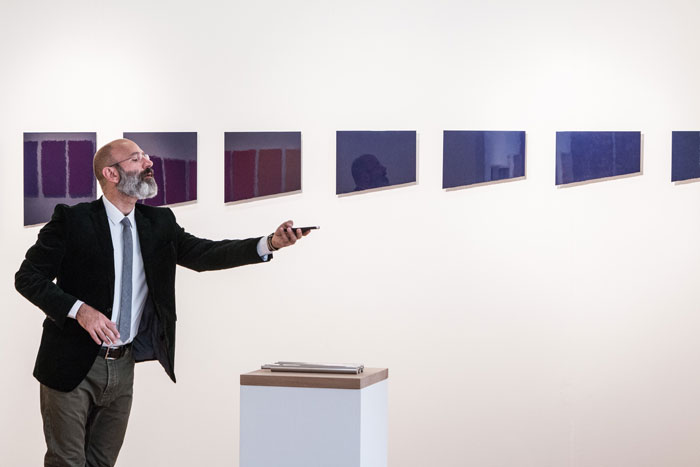 Dealer Jordanis Theodoridis in front of Matthias Liechti’s Black Eye Purple, 2013. Metal and car-paint multi-panel. Photo credit: David Willems. Courtesy of widmertheodoridis, Zurich.