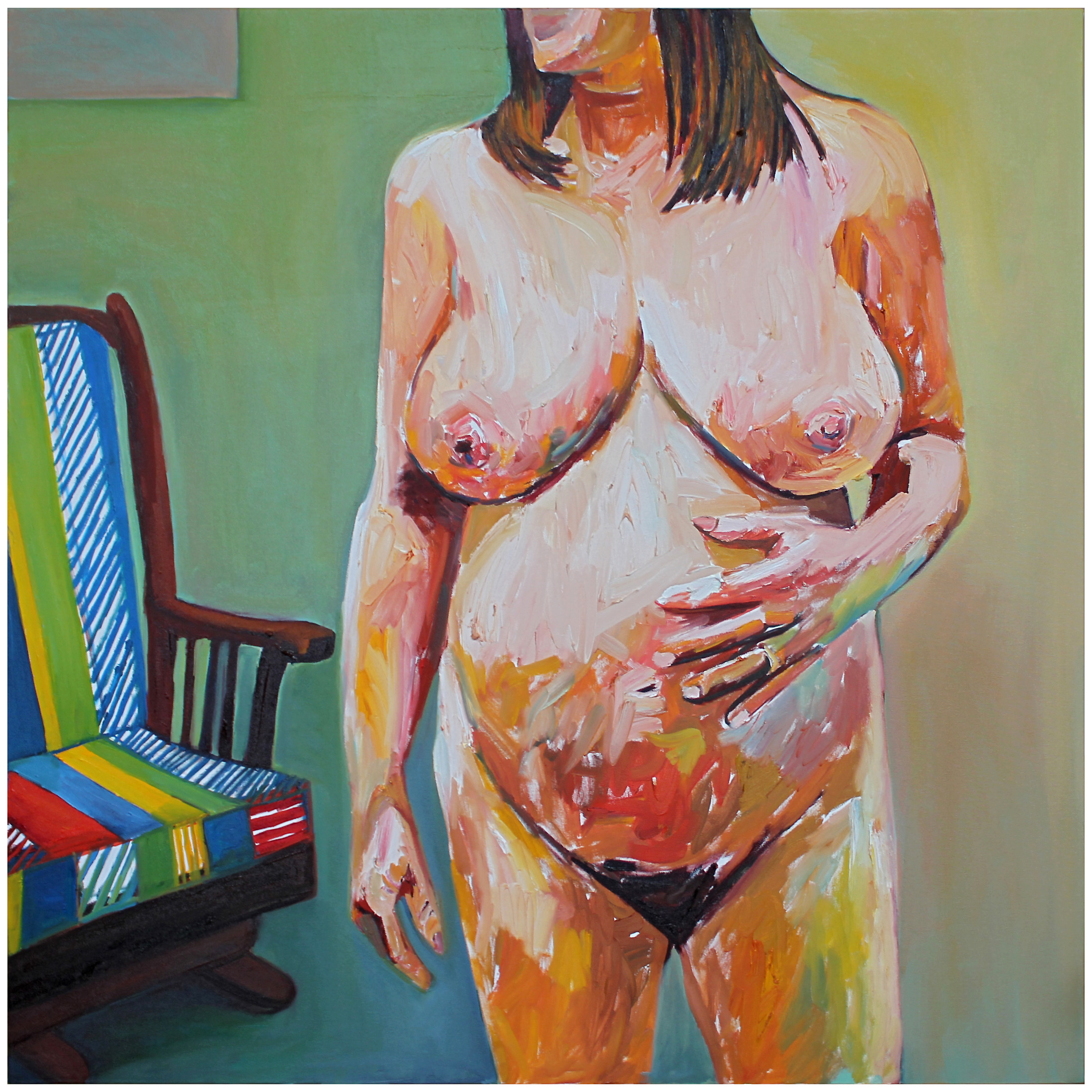 This same dialogue between subject and object is repeated in Annah Pregnant (2013), which illustrates a close friend of the artist, pregnant and unclothed. The composition of the piece elucidates a discourse between Annah’s naked body and a chair that resides in the left side of the painting; the edge of a picture frame is barely visible in the upper left hand corner. Annah’s face isn’t revealed to the viewer, but her chin points towards the chair behind her. The vigorous and curt brushstrokes fly in all different directions across the body. Her belly, arms, and breasts appear to be in flux, or in transition; her right upper thigh is blurred on its periphery. In contrast, the chair is concrete and stable. Incredibly opaque and axiomatic, the chair exposes the uncertainty of the body within the space.