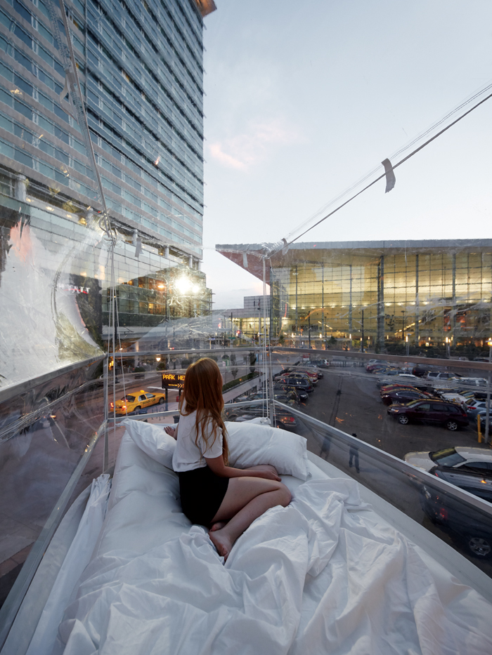 AS: And it was important to me being able to sleep in this space in the middle of the city and look up at the sky. The curtains come up at night. It’s not usually a view we think of when thinking of an urban space, just the sky, and the parking lot is one of the few open spaces in the city.