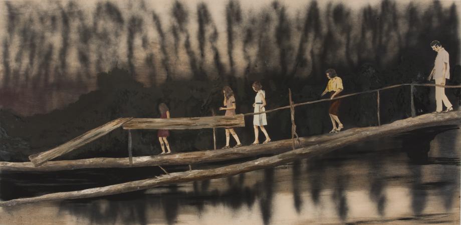 JS: I like that. Events tend to happen suddenly, in-between a seemingly endless string of banality. One of the most striking things about this series are your titles. They are suggestive and enigmatic. Ramble On is one of my favorites. It captures the action but also a state of mind. Against the blackened background, the figures are descending to nowhere. There is a poetic quality about that image that I love. What role does poetic thought or narrative play in your work?