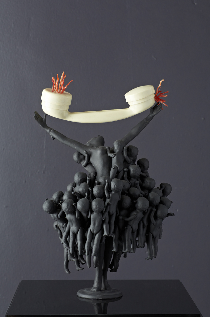 In Jizz (2012) I am addressing how modern day communication is increasingly reliant on electronic devices of all kinds. Everywhere you go, on the train, the bus, walking in the street, even in the classroom, movies and concerts, and airplanes, when all electronic devices are supposed to be silenced, you see people talking and texting on their mobile phones and IPods. In Jizz numerous children are seen crawling up to the phone that is held by a woman. From the phone sprouts coral, one of my symbols for life. It seems that young people, and us too, can hardly live without phones. Face to face communication is happening less and less. Nowadays, almost all contacts are handled by mobile, Facebook, or other so-called “social” media. If our phone has no connection we utterly panic. It kills creativity. Jizz is actually an indictment of the fact that, real or imagined, you are not allowed to be inaccessible.
