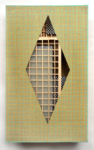 In 198 (dc), paint is applied to a wood support, but that substrate is also image: it’s an elaborate grid of layered wood strips, which cutouts in the painted front surface reveal from the picture plane. Meanwhile the painted image, an optically active grid of black and white squares, is a material slab of acrylic film directly glued to the wood. The resemblance of the grids, and the equivocation of figure and ground at the level of image and physical material, confound distinctions between structure and surface.