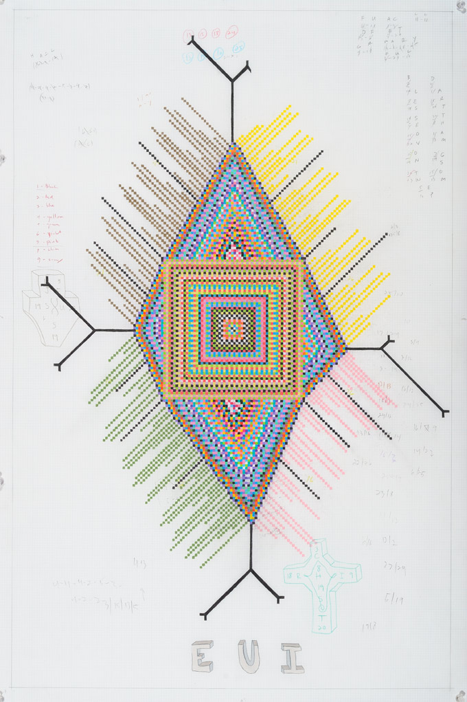 John O’Connor also indexes research material in his drawings, which underscore the imbrication of psychological experience with an information economy. As the Surrealists channeled the illogical logic of the unconscious, O’Connor cultivates delirious overloads of information processing. He produces drawings by using shifting, idiosyncratic codes: converting text into numbers, reversing letters, translating letters into colors by randomly devised systems, running garbled text through an electronic dictionary.