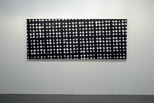 Also patternlike but dizzyingly evasive, We Can Build You is a more physically factured, painted version of the image at greater magnification. It resembles representations of biological code, and its title (taken from the Phillip K. Dick novel) evokes the manipulations of biotechnology, and more generally the way technological capitalism works on us. Francis’s pieces invite contemplation of hypermediation and replication, as well as contingency, fissure, and friction, with a coolly observant gaze.