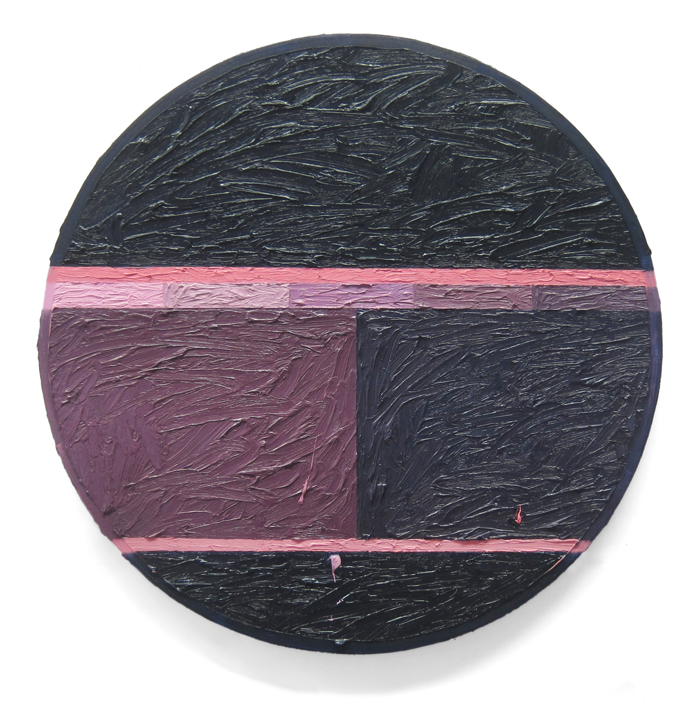 The paint is thick, and vivid, and lush—probably not yet dry. The works smell like oil paint but I still see and read them like graphic, flat compositions. All these other elements are there but don’t get in the way of the literal or implied image. Tyler still retains the remnants of his older style of messy, bad painting. All the paintings at DCKT except the tondo works have double line borders made by squeezing paint directly out of the tube. He does not use this technique as a statement of immediacy. The painted borders act like modernist frames.