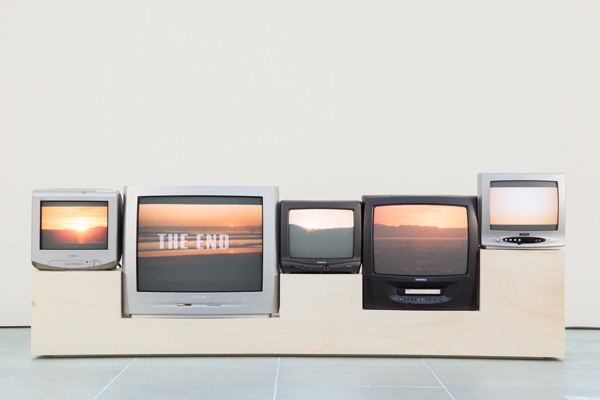 For the video installations Day is done (2013) Lauren and Adam scoured through numerous hollywood films to amass a digital archive of sunsets that play on loop on countless television sets. Sunsets represent the moment of perfect, lasting romance, yet rarely live up to what the promise… Critically exploring the role of the media in creating and fostering such fantasies in society, they confront us with our own habits of seeking comfort and hope for perfect love in movies. Their immersive work hauntingly reminds us that many of our fantasies and dreams, creating a bright future that will never exist, make us lose much more than we will ever gain.