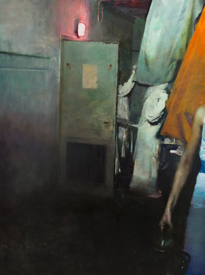 PB: And here we return to the exploitation of the figure. In much the same way as Goya’s juddering lunatics were in reality entertainment for the Spanish masses; we see a reflection of that idea in your works. The narrative composition of your paintings reflect the presence of a furtive third party. The existence of a work of art is determined by a viewer as part of its own equation. Within this you construct a visual narrative that exemplifies the triad between artist, work, and viewer. The image suggests the existence of a voyeuristic third party as an internal part of the narrative of the painting itself, as well as the essential presence of a viewer in the equation of artist, art object, and viewer. Would this, if intentional, give the painting a quiet self-awareness, and a slight conceptual lean?