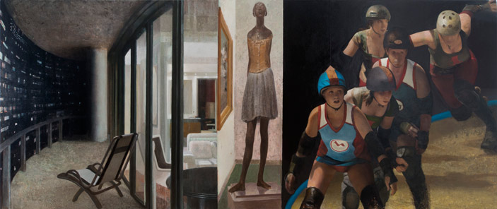 Ekphrasis, on the other hand—an enervate triptych mere footsteps down the wall—attempts to capture in one of its three panels an instance of outright motion: five stop-framed skaters in a roller derby match. Roller derby is that grand spectacle where teams of women brawl and spit and elbow each other headlong out of the rink—a pleasurable display of thuggery that generally whips the crowd into a playful frenzy. The sport, the women, and the crowd all allow wholesale license for the artist himself to be equally playful in the rendering, joining in his subject’s good fun, but Desiderio will have none of it. What he gives us instead is a sour, sad little portrait of women who are more skittish than draped in natural swagger. They mope, as if shrinking from some stern scolding. Observing them is no easy task (nor is it pleasant), for nothing in the scene pulls us in, particularly not these symbolic creatures, but nothing in the artistry as well. There are the gauzy delineations of craftsmanship, but the effect is thin and insubstantial. Worse, the image is utterly devoid of presence, which makes our viewing slightly unsettling because a suspicion creeps in that the Desiderio we’ve warmed to over the years has in the interim been snatched off by Pod people. As with the Pods, something of a replacement hand feels at work here, one fallen soft, somnolent, and one-dimensional. Lacking in particular is any distinctive voice, which in absence strangely unspeaks the painting’s title.